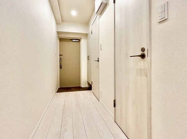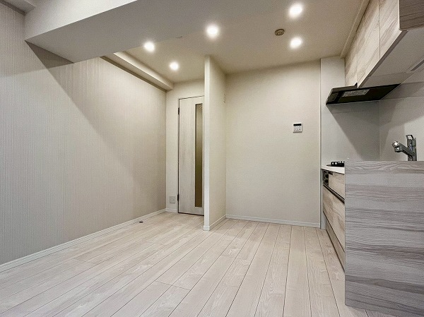 今回ご紹介するのは3階に位置する1DKのお部屋。お部屋全体はベージュ調で統一され、すっきりとした印象。複数のダウンライトがお部屋全体を明るく照らします。毎日住んでも飽きの来ない、シンプルで洗練された空間です。