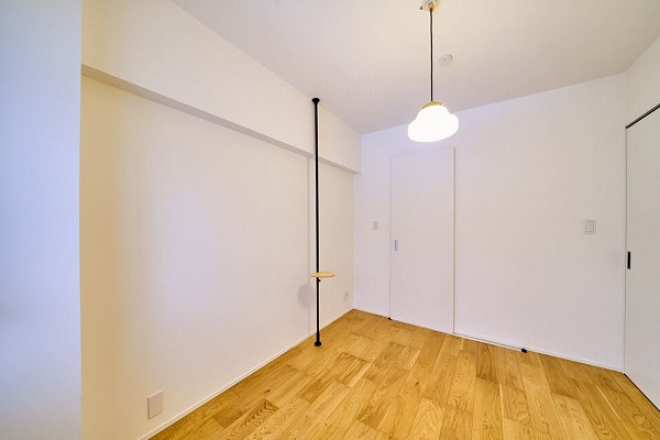 北側に位置する、おおよそ5.6帖の洋室。大きめのベッドもゆとりを持って置けるサイズ感です。手前には大容量サイズのウォークインクローゼットを完備しています。季節もののコートやかさばりやすいダウンジャケットなども綺麗に保管できる、便利なスペース。