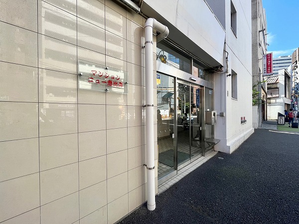 恵比寿通り沿いに佇む、こちらが『マンションニュー恵比寿』。真っ白な壁と規則的なデザインが目を引く外観ですね。マンションの裏側はバルコニーの中央が少し出っ張ったデザインで、落ち着いた雰囲気も感じます。