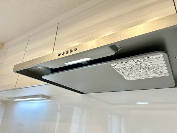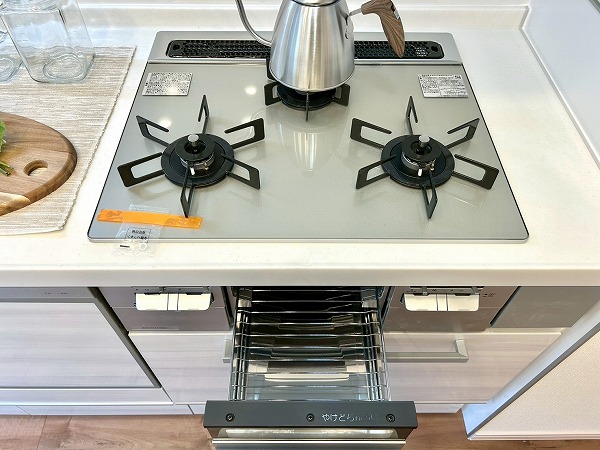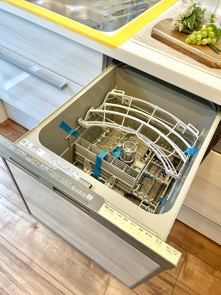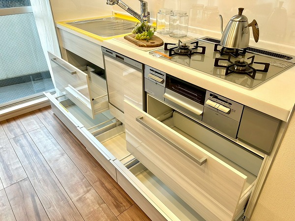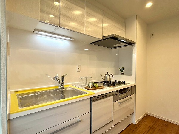 壁付けキッチンはお料理に集中できる造り。収納豊富でキッチン周りもスッキリとした印象を保てそう。3口コンロ、食洗機付きで毎日の家事をスムーズにこなせます。