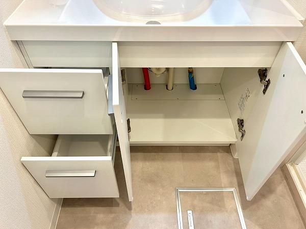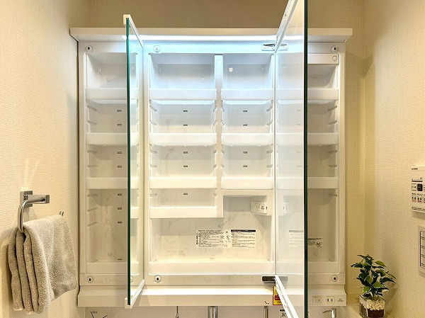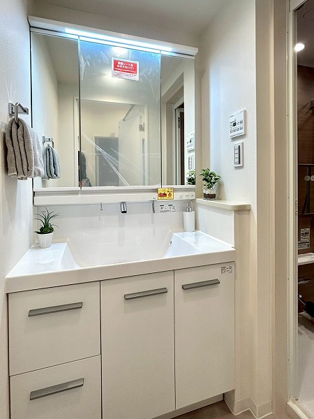 独立洗面台とバスルームがまとまったサニタリールームは生活動線がスムーズです。洗面台は人気の3面鏡を採用しており、大きな鏡で毎日身支度ができます。ミラーキャビネットも付いているので満足のいく収納。