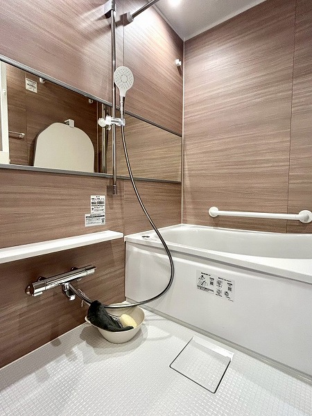バスルームは木目調で落ち着きと暖かみを感じるデザイン。追い焚き機能、浴室乾燥機付きでいつでも快適な温度で入浴ができ、雨の日でも洗濯物を乾かすことができるのでとても便利です。