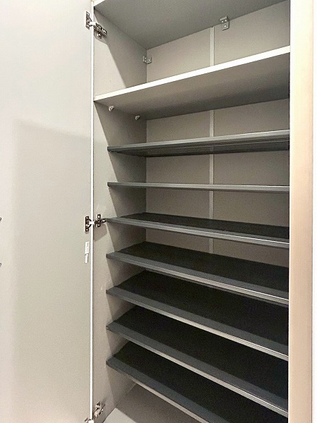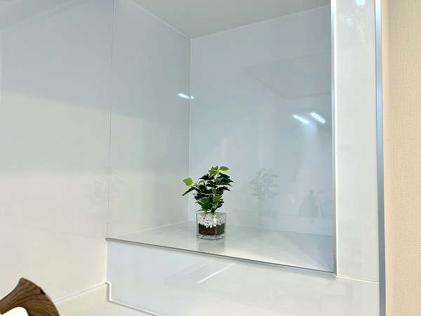 玄関は明るく清潔感が感じられます。シューズボックスの扉には姿見が付いているので外出時の身支度もスムーズに行えますよ。ダウンライトも付いており、夜に帰宅した際に、足元をやさしく照らしてくれるので、安全性も高まります。
