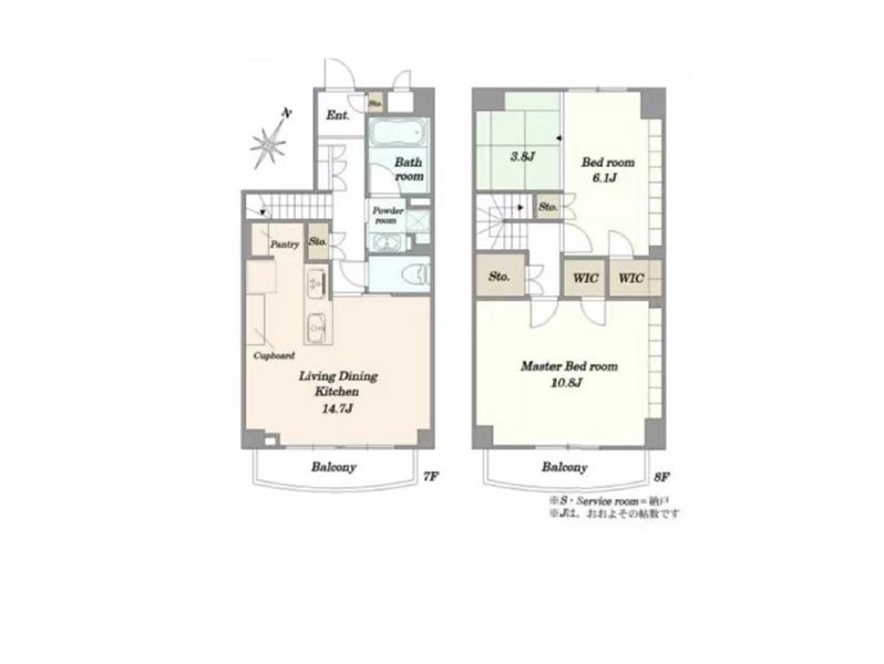 今回ご紹介するのは7・8階部分に位置するメゾネットタイプの住戸。専有面積は92.95㎡の2LDK、東南向きの角部屋という条件が揃い、開放感と採光に恵まれた一室です。下階には約14.7帖のLDKが広がり、バルコニーに面した明るい空間が日常の中心に。キッチンは動線が整理された配置で生活感を抑えつつ使い勝手の良さも感じられます。上階にはプライベート性の高い居室を配置。主寝室は10帖超の広さがあり、WICを備えたことで収納力も十分。もう一方の洋室はワークスペースや趣味部屋としても活躍しそうなサイズ感です。上下階で空間を分けられるメゾネットならではの設計が、オンとオフの切り替えを自然に叶えてくれますよ♪