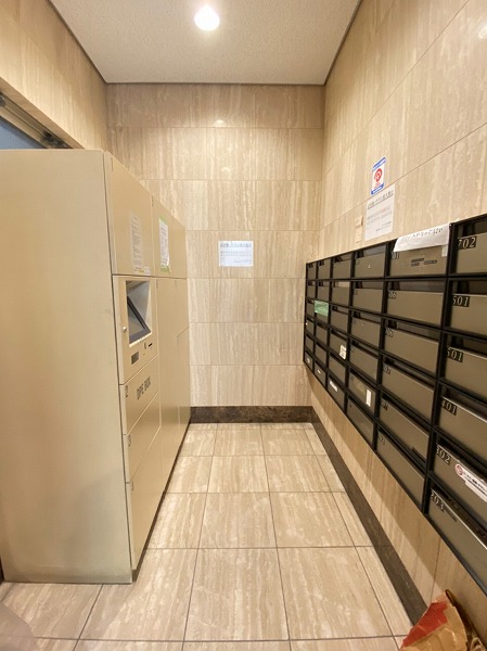 管理人室の脇を進むとエレベーターが設置されています。共用部は隅々まで丁寧に清掃されており、建物全体が常に清潔な印象。日々の管理体制がしっかりしていることが伝わってきました。