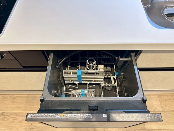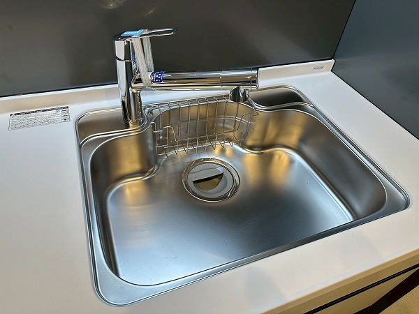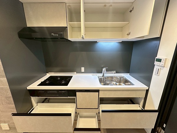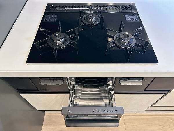 調理に集中できる、壁付けタイプのシステムキッチン。高級感溢れる人工大理石トップ、ガラストップのグリル付き3口コンロ、便利な食洗機、浄水器内蔵シャワー混合水栓を搭載しています。