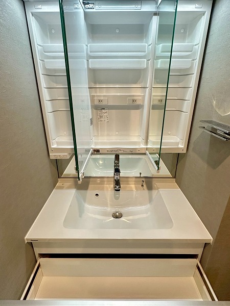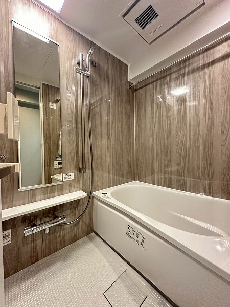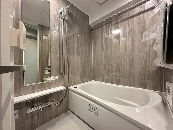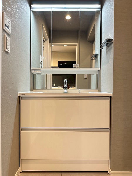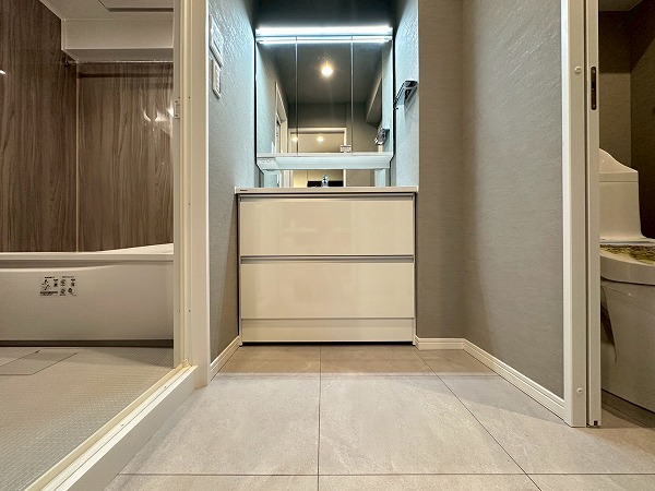 サニタリールームには洗面台とバスルームがまとまっています。落ち着いた色味でデザインされたバスルームには、快適なご入浴に欠かせない追焚き機能&浴室乾燥機を搭載。機能面も充実しています。
