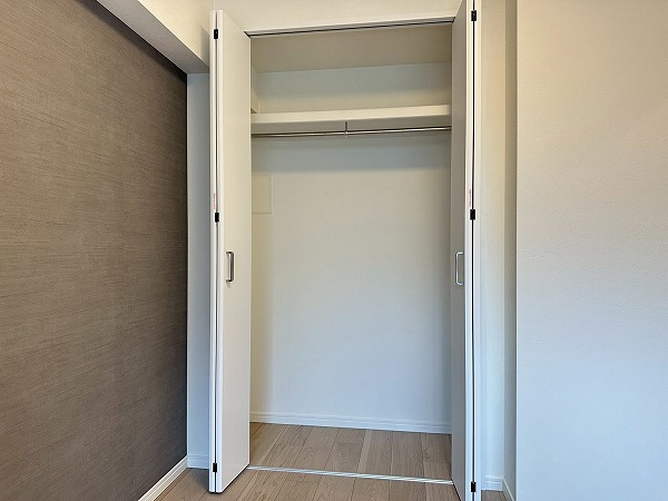 玄関を上がって最初のお部屋は、約4.3帖の洋室。大容量サイズのクローゼットには、季節もののコートやかさばりやすいダウンジャケットなどもたっぷり保管できます。