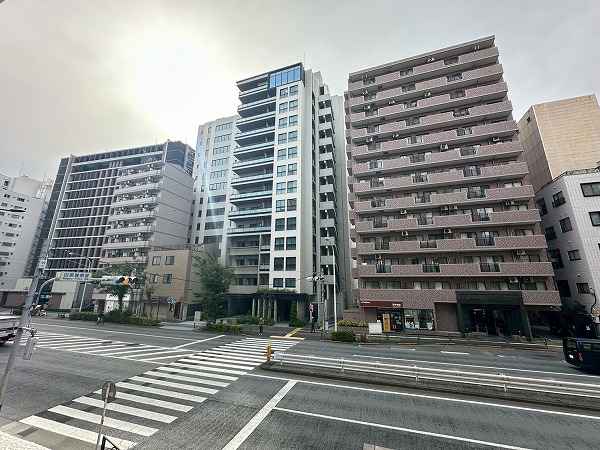 大通り沿いにどっしりと佇む白い建物が『ニックハイム中目黒』。地上11階建て、総戸数81戸のマンションです。過去に大規模修繕工事が行われ、綺麗な外観が保たれています。