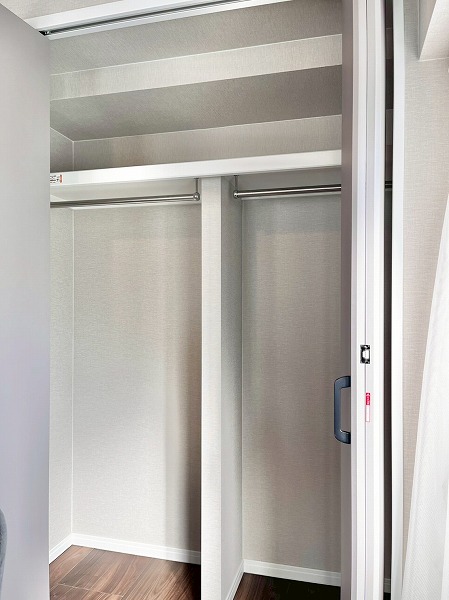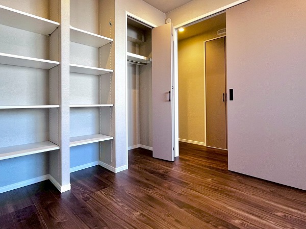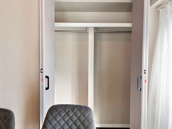 ベッドを置いてゆったりとおやすみいただけるベッドルーム。壁面にシェルフとクローゼットが付いており、毎日のお洋服を整えてしまっておくことができます。シェルフは可動式になっており、趣味の物や高さのある本でもジャストサイズで収納でき、安心です。