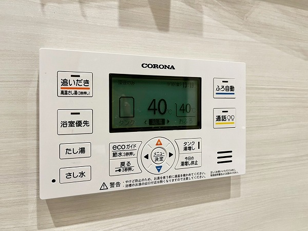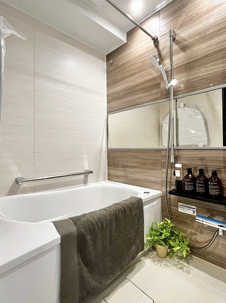 ホワイトとライトブラウンのコントラストが軽やかなバスルーム。たっぷりとお湯を張ったバスタブに浸かれば、1日の終わりに心地よい空間へと導いてくれます。追い焚き機能が付いており、長風呂派の方でも快適な温度を保つことができますよ。