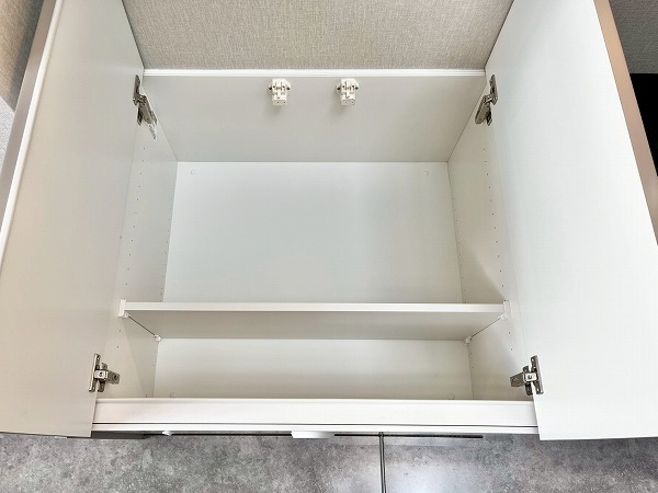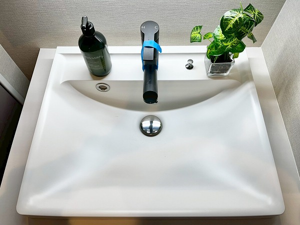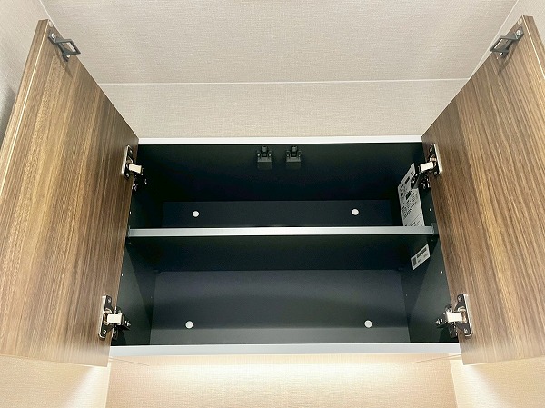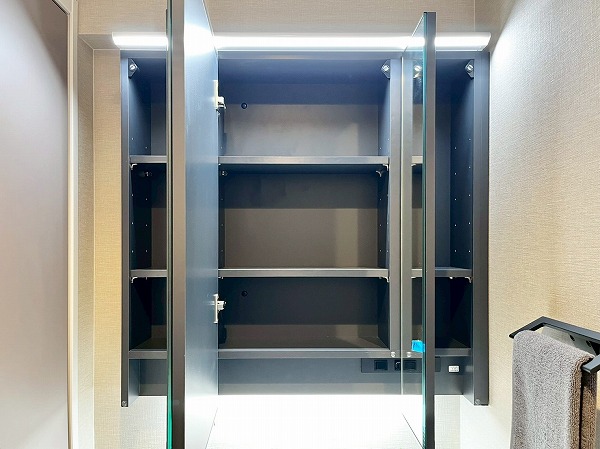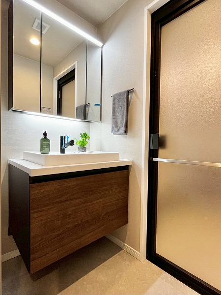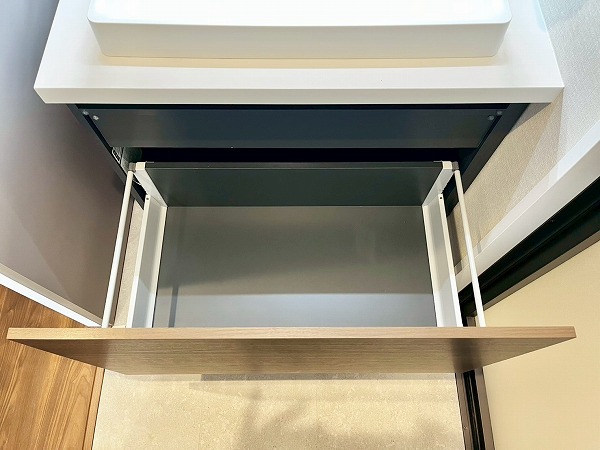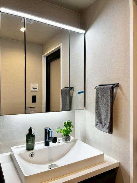 洗面化粧台の幅広のミラーには鏡が内蔵され、お顔を綺麗に照らして身だしなみも美しく整います。スクエア型のスタイリッシュな洗面ボウルの下部には高さのある収納が設けられ、洗剤などを縦に置いておけば使いやすく◎