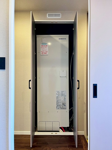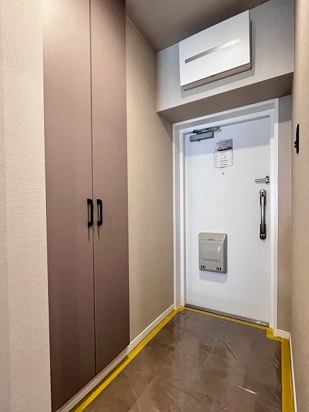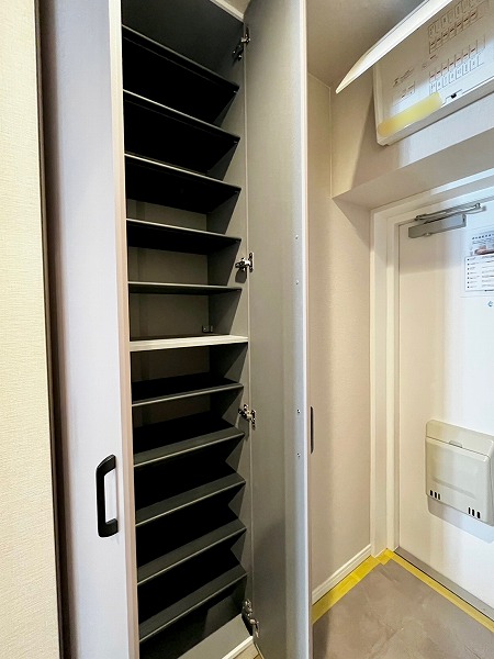 廊下はアースカラーの扉と木目調の床が採用され、落ち着いた印象に仕上がっています。玄関扉を開けた瞬間に洗練の空間が広がり、帰宅するたびに気分も上がりますね。玄関ポーチの横にはシューズボックスが完備されており、お1人分の靴なら余裕で入るサイズ感が心強いです。
