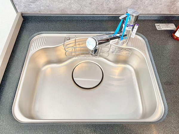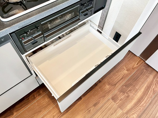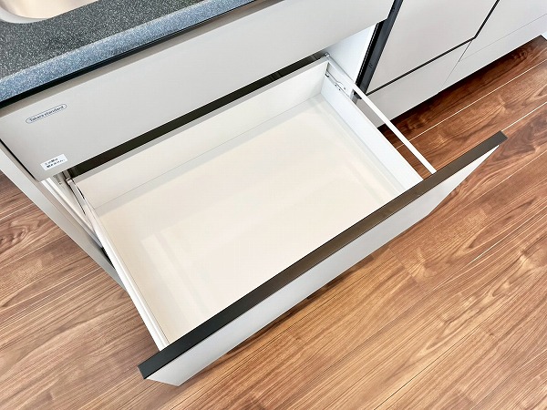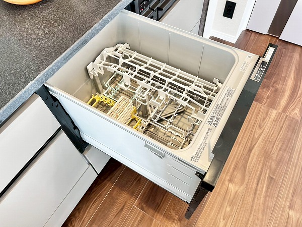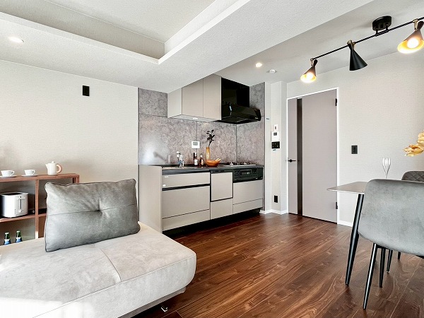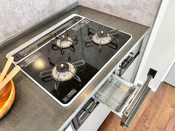 グラニット調のワークトップがおしゃれなキッチンは壁付きになっており、お料理の空間と生活の空間が自然にゾーニングされた理想の形。3口コンロと食洗機が搭載されており、お料理好きな方も存分に楽しめる環境です。