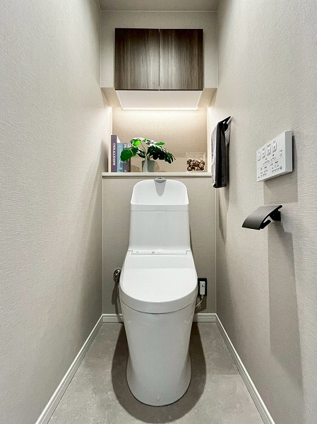 ホワイトで統一されたトイレには、実用的にお使いただける収納棚と合わせてニッチ棚が設けられています。小さな空間だからこそちょっとしたアイテムで個性を出すのも楽しそうですね。間接照明が照らすおかげで、ただフレグランスを置くだけでも様になるスペースです。