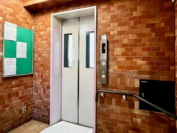 オレンジ色のレンガ貼りが特徴的なエントランス。防犯カメラと常駐している管理人さんが安全を見守っていますよ。エレベーターホールにはスロープが付いており、キャリーバッグやベビーカーをお持ちの際もスムーズ♪