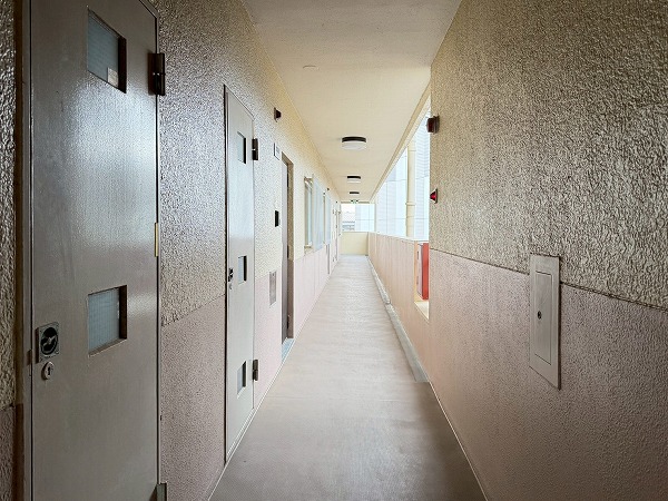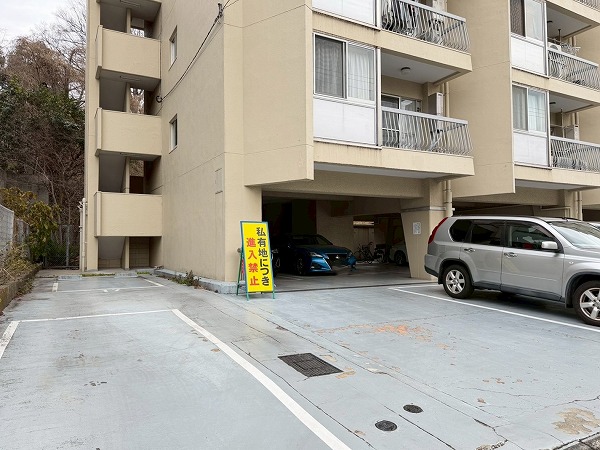 広々としたアプローチ。昭和築でレトロな雰囲気ではありますが、隅々まで綺麗に保たれていました。敷地内には駐車場と駐輪場を完備しています。