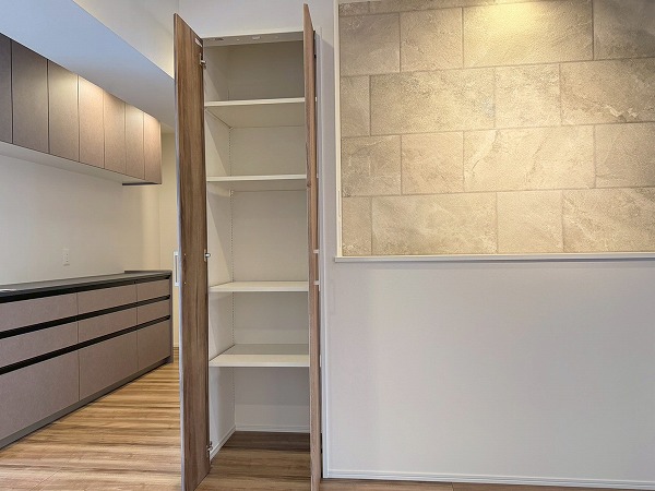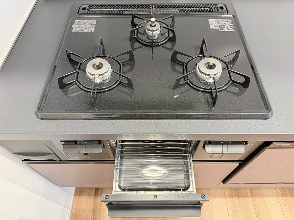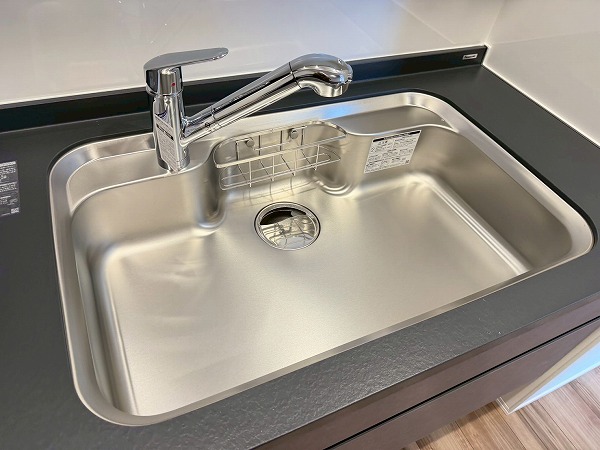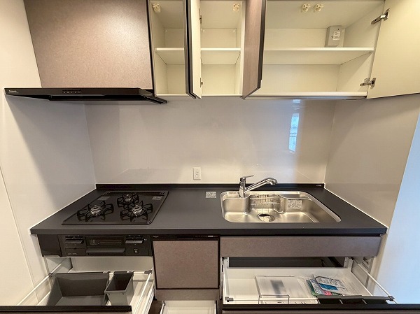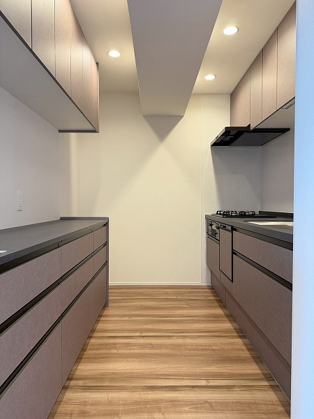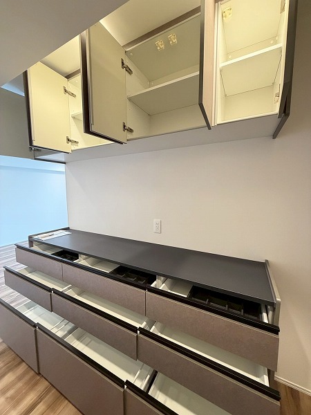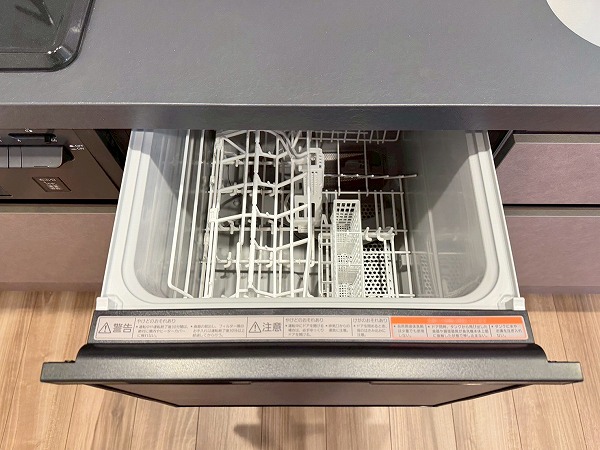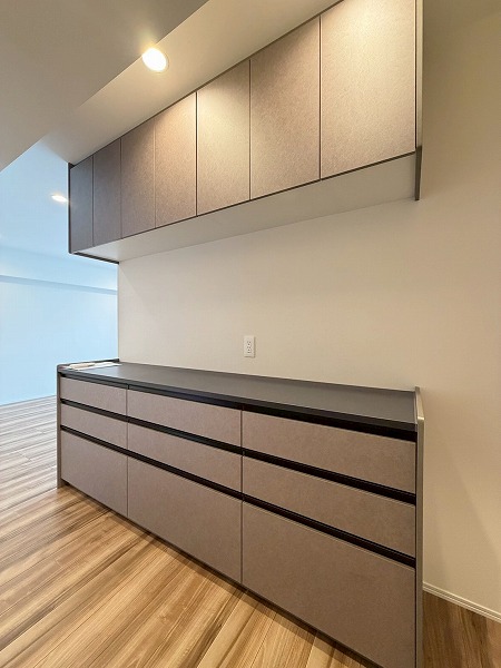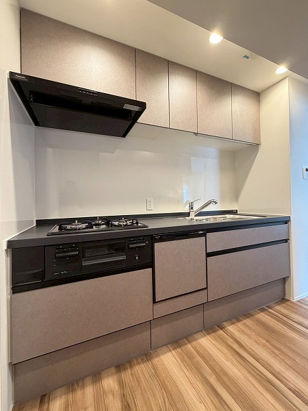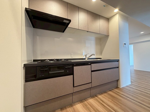 システムキッチンは浄水機能付水栓・食洗機付の設備充実仕様。調理から後片付けまで効率よくこなせるレイアウトです。カップボード付きで収納部分も確保され、日用品や食器を整理しやすい環境が整っています。