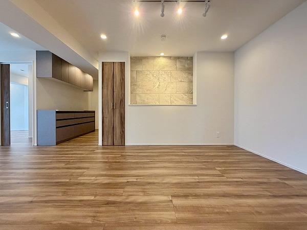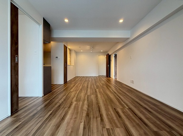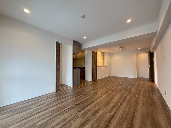 約18.1帖のリビングダイニングキッチンは、南西向き角住戸ならではの明るさが魅力です。大きな開口部から光が差し込み、日当たり良好の心地よさを実感できます。2面採光により風の通り道が生まれ、室内に自然な奥行きが感じられます。