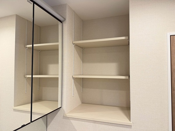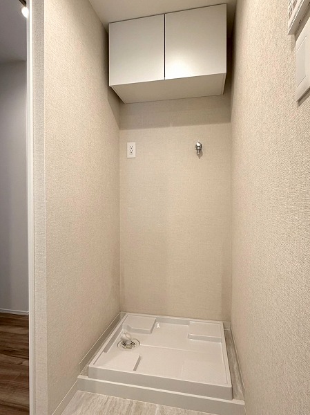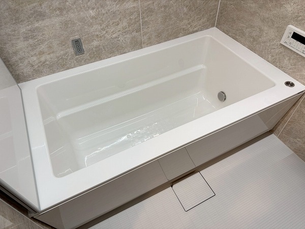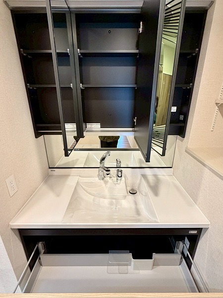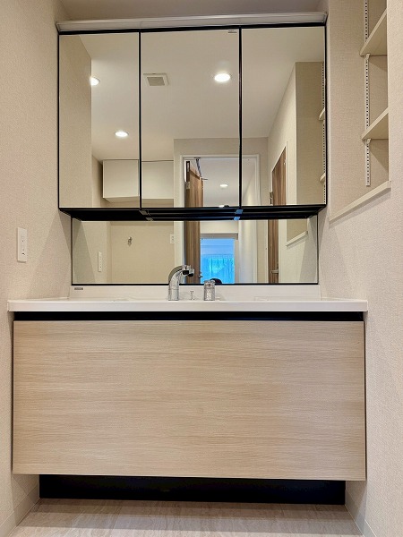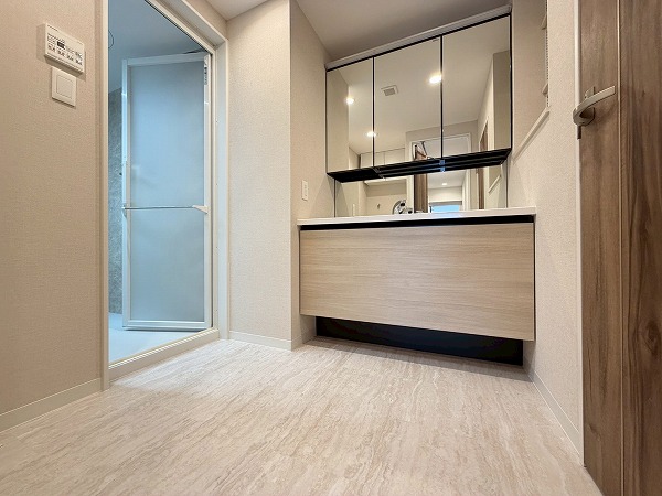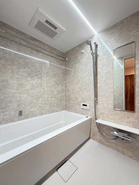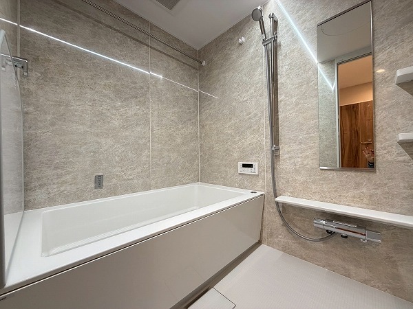 ユニットバスには浴室換気乾燥機能を備え、天候に左右されにくい環境です。追焚機能付給湯器により、時間差入浴にも対応。ゆとりあるサイズ感で、身体を伸ばしてくつろげます。洗面室と一体的に配置され、動線もスムーズ。日々の疲れを静かに整える空間です。