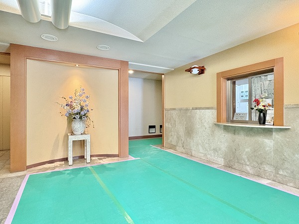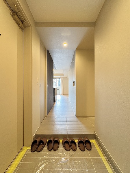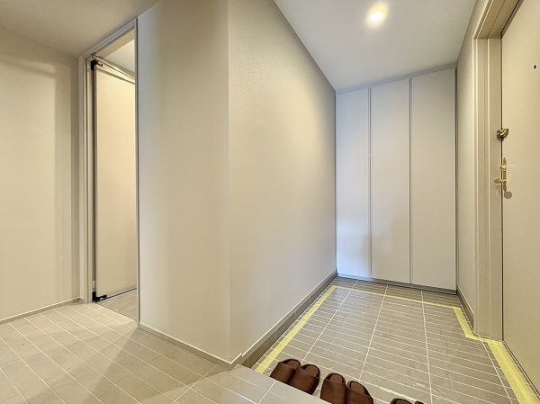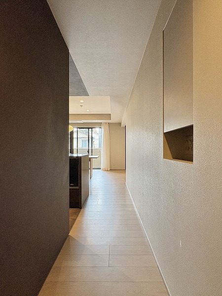 オートロックを抜けると広々としたホールが。こちらに宅配ボックスや管理人室があります。各住戸の玄関やエレベーターが外から見えない、プライバシーに配慮されたレイアウトとなっています◎