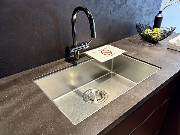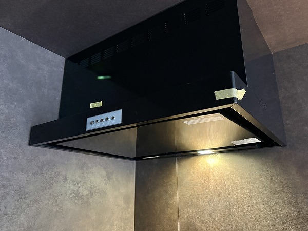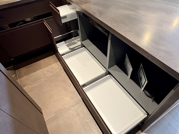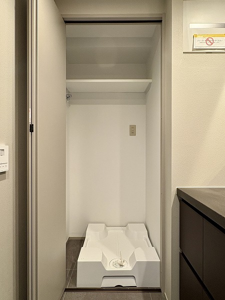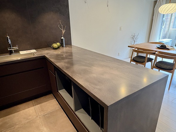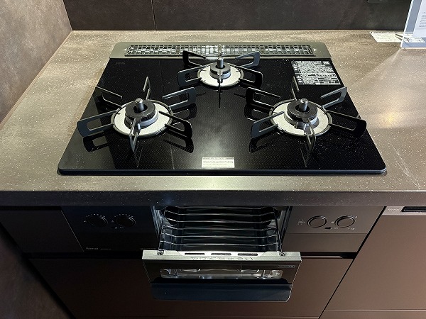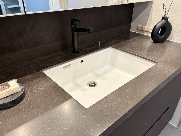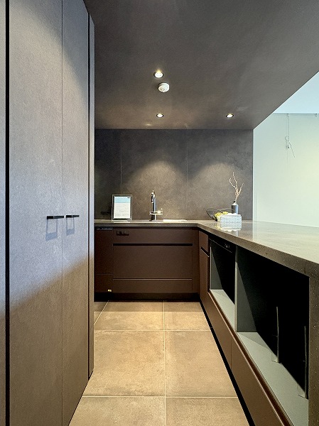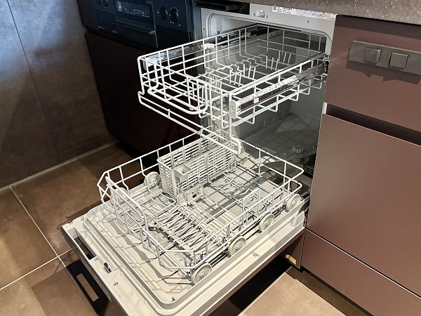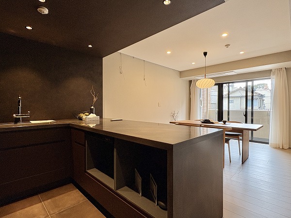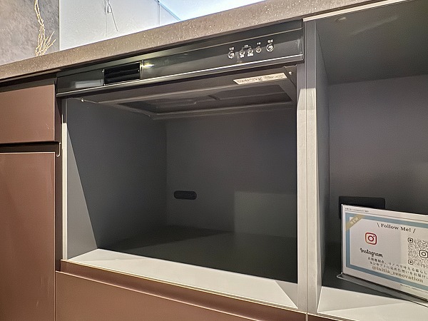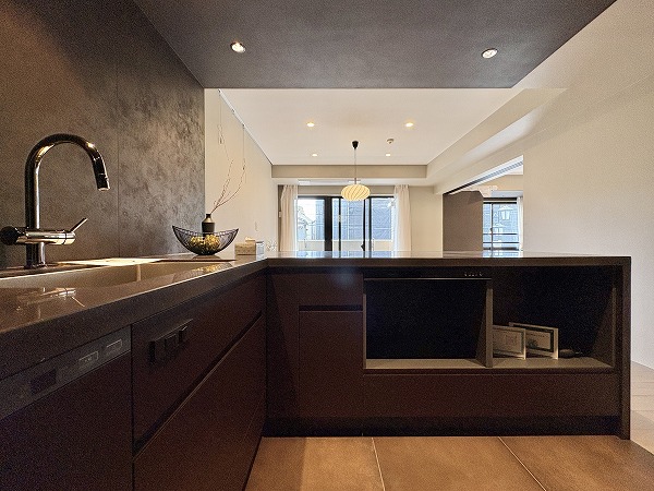 大きなカウンターが付いたL字型のキッチンスペース。浄水器一体型水栓と食洗機のほか、炊飯器を始めとした調理家電を置くのに便利な蒸気排出ユニットも完備しています。シンクとコンロは壁側を向いているため、水や油がダイニング側に跳ねて汚れる心配がありません。