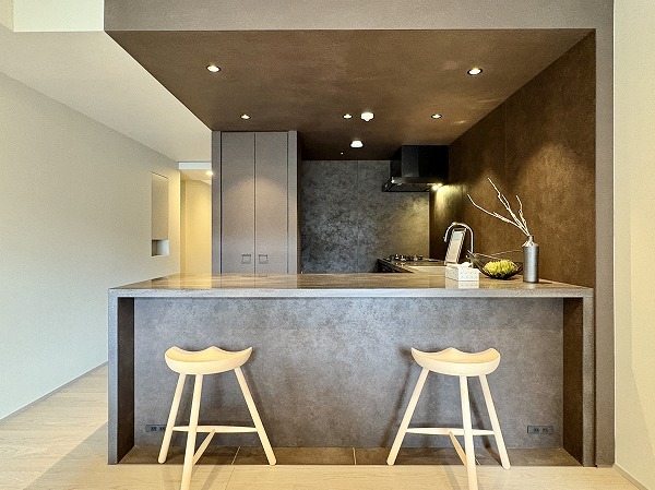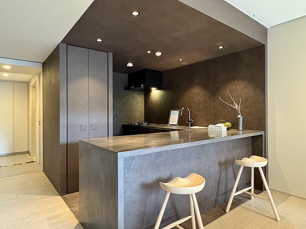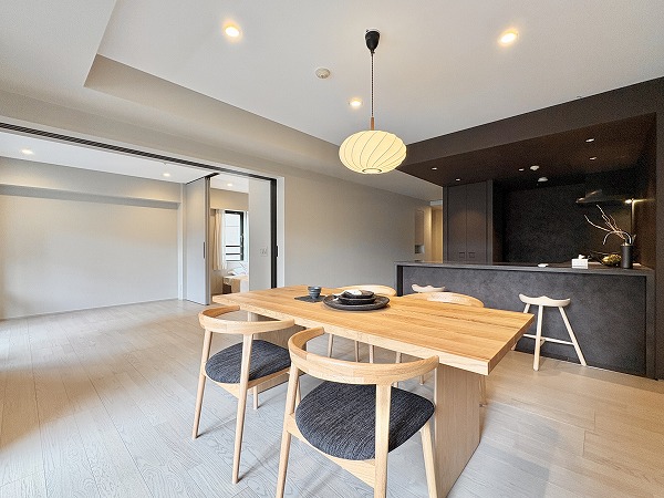 リビングダイニングキッチンの広さは約15.5帖!黒のキッチンスペースが目を惹く、スタイリッシュな印象の空間となっています。壁上部にピクチャーレールが付いているので、お好きなアート作品などを壁に穴を開けることなく飾れますよ。床暖房&ビルトインエアコンを完備しており、オールシーズン快適!