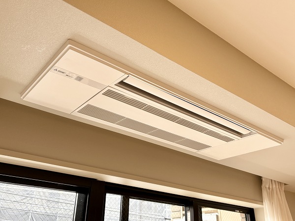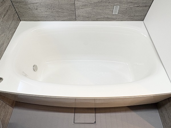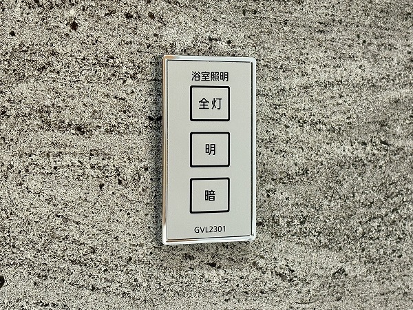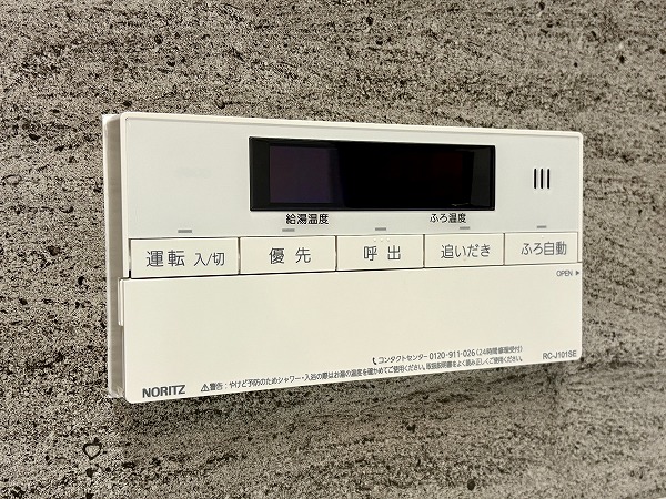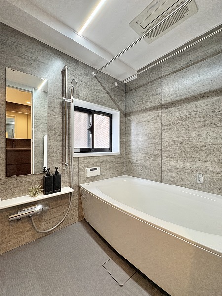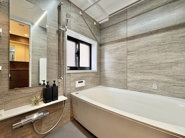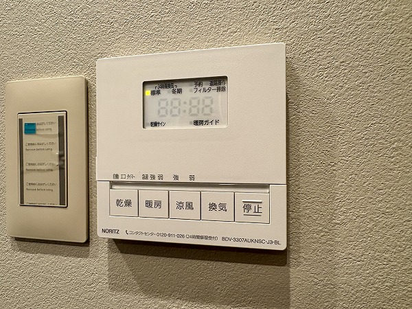 追い焚き機能と浴室乾燥機を備えたバスルーム。マンションのバスルームとしては標準的な1418サイズです。シックながら暗い印象になりすぎない配色がGood◎照明の切り替えスイッチが付いており、気分に合わせて色味を変えることができます。