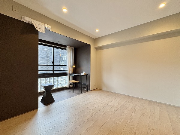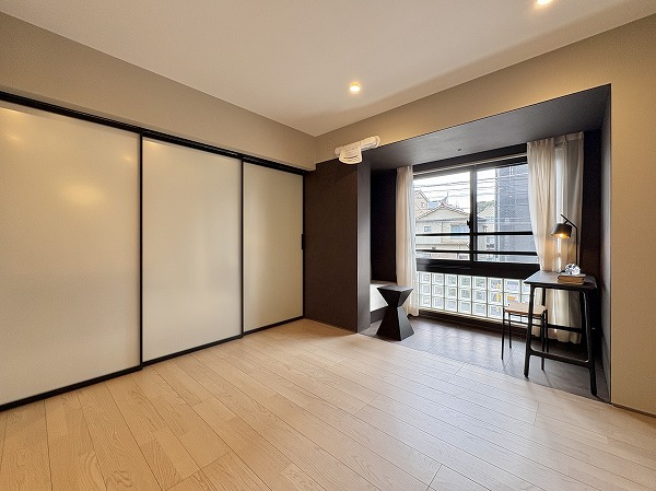 リビングダイニングのお隣に配置されている洋室は約7.8帖です。扉を開けておいてリビングスペースとして使うも良し、寝室として使うも良しのフレキシブルな設計◎窓際のヌックには備え付けのベンチがありました。陽の光を感じながらゆっくりと読書をしたりするのに良さそうですね。