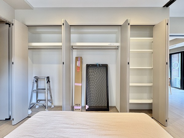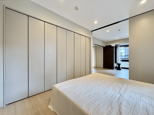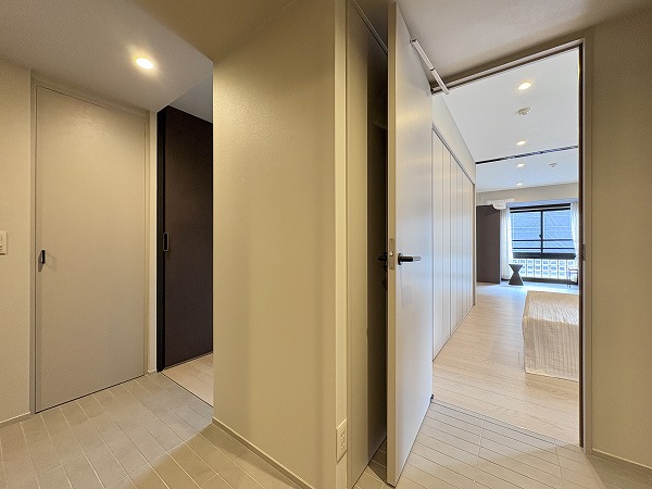 もう1つの洋室は、リビングに隣接している方の洋室と室内廊下の2方向から出入りできます!廊下側に出るとすぐ目の前にトイレや洗面スペースがあり、生活動線の良さが魅力的です。窓と反対側の壁は全面収納スペースになっており、衣類の収納場所にも困らなそう。