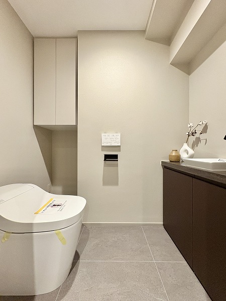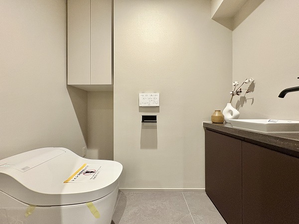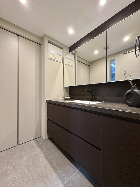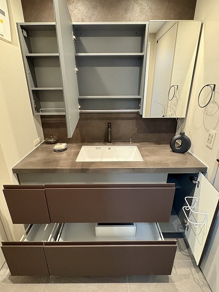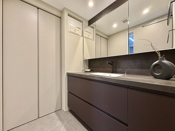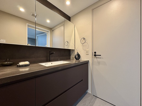 洗面スペースの幅をフルに使った大きな洗面化粧台を新設。洗面ボウルの両サイドにたっぷりとスペースがあるので、スキンケア用品やハンドソープなどの置き場に困りません。洗濯機置き場は正面に見える扉の中に。使用後のタオルや衣類などを簡単に隠せますよ。