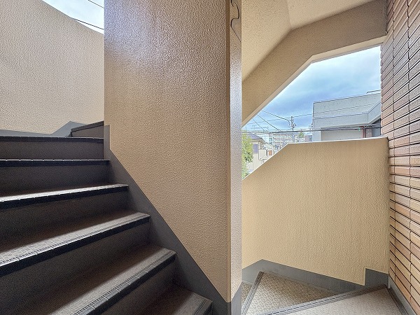 エントランスは防犯性に優れたオートロック式。ツートーンの壁と木製の扉の組み合わせがお洒落です✧防犯カメラも設置されており、安心感がありますね。