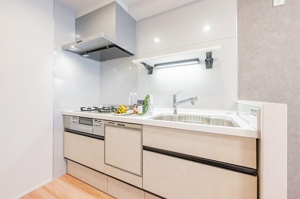 リビングの手前には、システムキッチンを完備しています。ご家族とのコミュニケーションも取りやすい配置ですよね。複数品の同時調理が可能なグリル付き3口コンロ、便利な食洗機を搭載していて、毎日の家事もスムーズに捗りそう♪