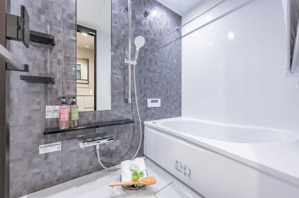 バスルームにはグレーのストーン調パネルを採用し、落ち着きと高級感を演出。ミラーやカウンター、ラックが備えられており、使い勝手にも配慮されています。追い焚き機能付きのバスタブは、1人でくつろぐには十分なサイズ感です。