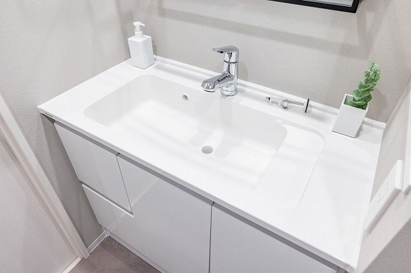 サニタリールームには、洗面化粧台・洗濯機置き場・バスルームが集結。水回りの機能がまとまっていると、家事動線もスムーズですよね。洗面化粧台には、人気の3面鏡が採用されていました。