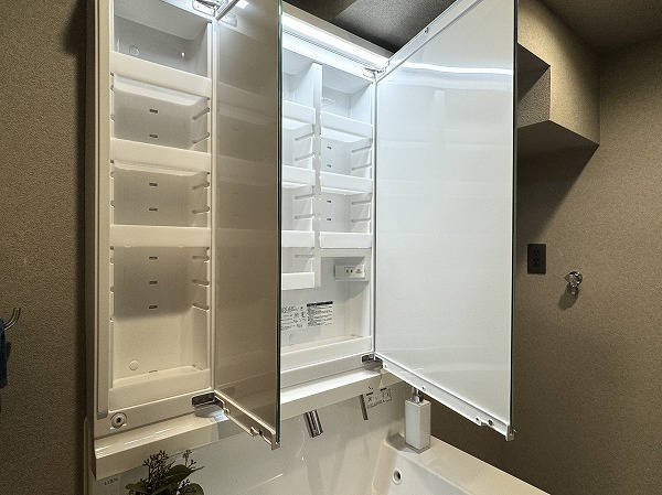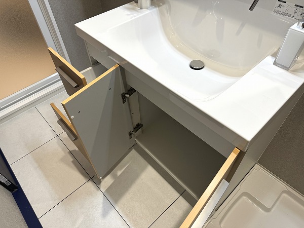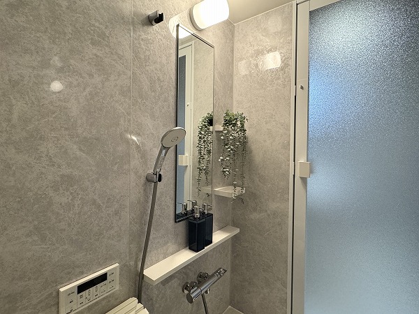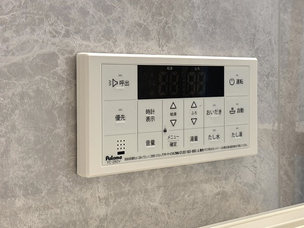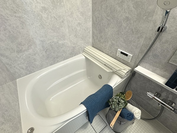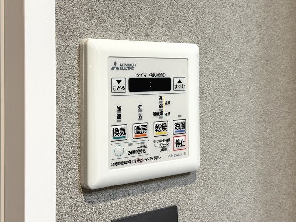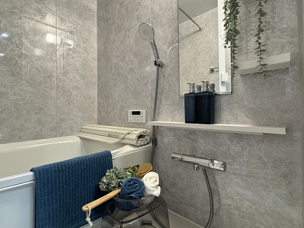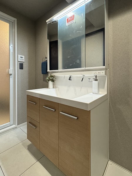 パウダールームは、洗面化粧台、洗濯機置き場、バスルームがまとまった効率的なレイアウト。グレーのスタイリッシュなバスルームには追い焚き・浴室乾燥機能付きで、入浴のタイミングが自由に調整可能◎