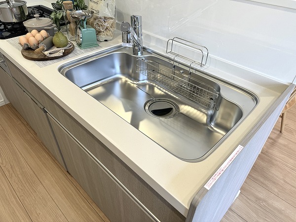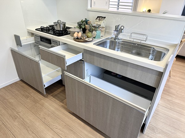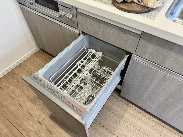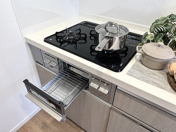リビングと繋がるグレーのペニンシュラキッチン。食洗機やグリル付き3口コンロ完備で効率よく調理や片付けができ、料理中も会話を楽しめる空間です。デザイン性と使い勝手が両立した、暮らしの中心となるキッチンになりそう✦