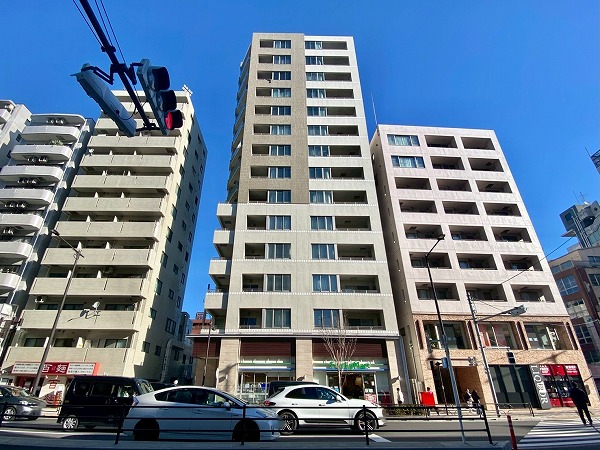 山手通り沿いに建つ『クレヴィア中目黒』は、ベージュを基調としたスタイリッシュな外観が印象的。2012年築、14階建て・総戸数66戸のマンションで、新耐震基準を満たしており構造面でも安心感があります。都心の利便性を享受しながら、落ち着いた佇まいを保つレジデンスです。