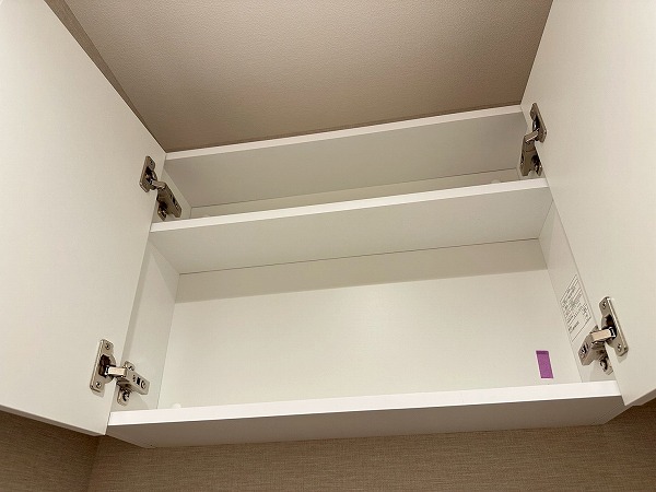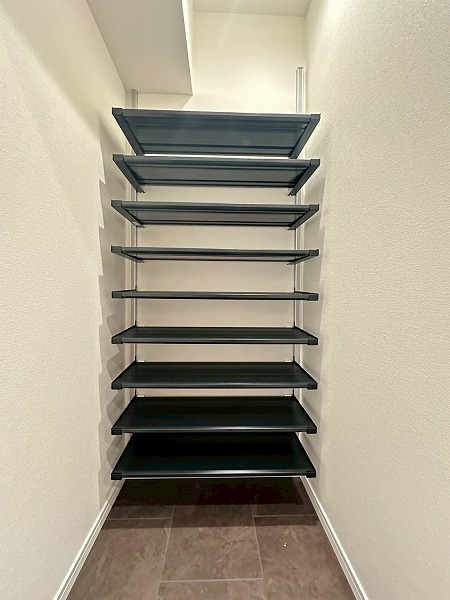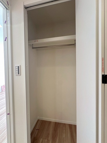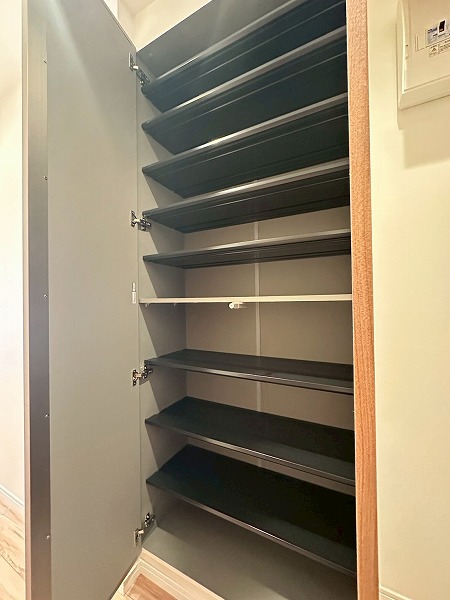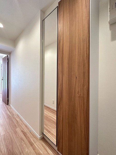 オフホワイトのクロスと木目調のフロアが温かみのある玄関。右側にはトールタイプのシューズクローゼットを完備しています。シューズクローゼットの扉の一部に姿見が備わっているので、外出前の身だしなみチェックもバッチリ◎