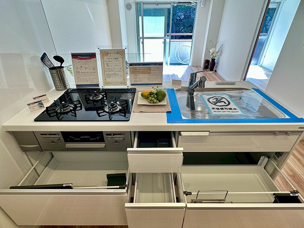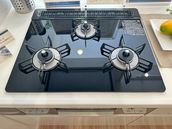 リビング全体を見渡せる、カウンタータイプのシステムキッチン。白を基調とした清潔感溢れるデザインで使い勝手も良好です。複数品の同時調理が可能なグリル付き3口コンロを搭載。