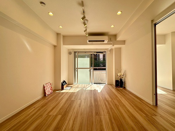 メインとなるのは、約11.3帖のリビングダイニングキッチン。南向きで陽当たりが良く、更にはエアコン1基が備わっているので、引越し直後から快適な暮らしをスタートできます。