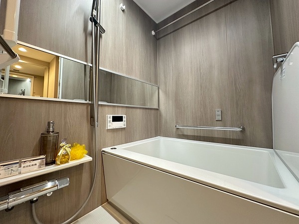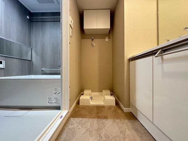サニタリールームには洗面台・洗濯機置き場・バスルームが集結。水回りの機能がまとまっていると、生活動線もスムーズですよね♪バスルームには、快適なご入浴に欠かせない追焚き機能&浴室乾燥機を完備しています。