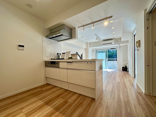 リビング全体を見渡せる、カウンタータイプのシステムキッチン。白を基調とした清潔感溢れるデザインで使い勝手も良好です。複数品の同時調理が可能なグリル付き3口コンロを搭載。