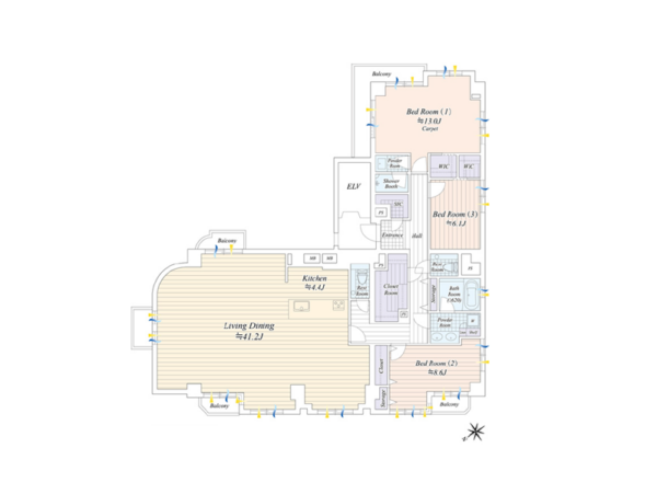 ご紹介するお部屋は、6階部分の北西角部屋。ワンフロア1住戸で専有面積は174.14㎡のゆとりのある空間です。メインとなるリビングダイニングは41帖超えの広さがあり、開放感があふれます。レイアウトの自由度も高く、暮らしのイメージがすっと湧いてくる印象です。室内はリノベーション済み。全体はシンプルなトーンにまとめつつ、水回りにはさりげないアクセントをプラス。主張しすぎないデザインが、空間全体に洗練された雰囲気をもたらしています。洋室は3室あり、世帯人数やお子様の成長に合わせてお部屋を選びましょう◎バルコニーは4か所あり、より開放感を感じられます。東京タワーや六本木ヒルズなどを望める眺望は、都会的な暮らしを印象的に映し出してくれますよ。