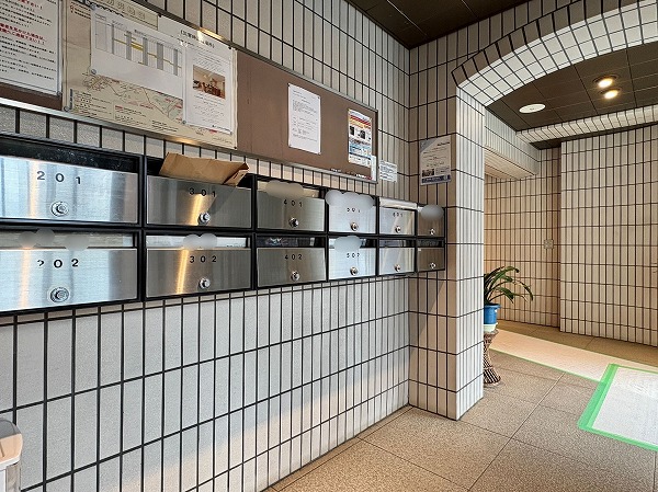 エントランスはオートロック式。室内は照明が明るい印象でした。エントランス左手にはメールボックスとソファを完備。必要に応じて活用しましょう◎