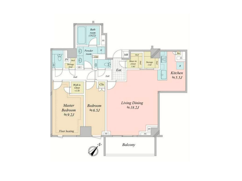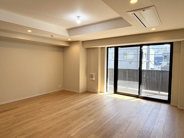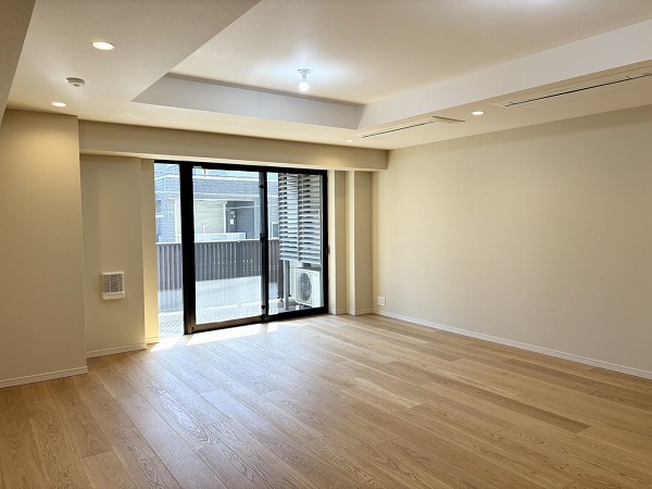 今回ご紹介したのは3階部分に位置する専有面積100.77㎡の2LDK住戸で、2人暮らしはもちろん子育て世帯でもゆとりをもって暮らせる広さ。全居室南東向きのため室内に入った瞬間から明るさを実感でき、心地よい空気が流れています。ペットの飼育も可能で、ご家族皆さまで新生活を始められるのも嬉しいポイント。メインとなるリビングダイニングキッチンは約18.2帖。床暖房が完備されており、足元からじんわりと伝わる温もりが印象的でした。床の近くで過ごす小さなお子様やペットにも優しい仕様です。天井にはビルトインタイプのエアコンを採用し、視界がすっきりと整うデザイン。空間そのものの美しさが引き立ちます。