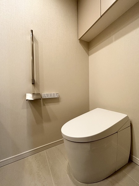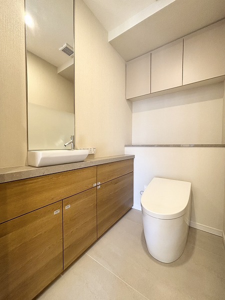 トイレは2か所に設置され、どちらもシンプルですっきりとしたデザイン。温水洗浄機能付きで、季節を問わず快適に使用できます。加えて手洗いカウンターも完備し、来客時にも配慮。清潔感と機能性を両立した設計に。