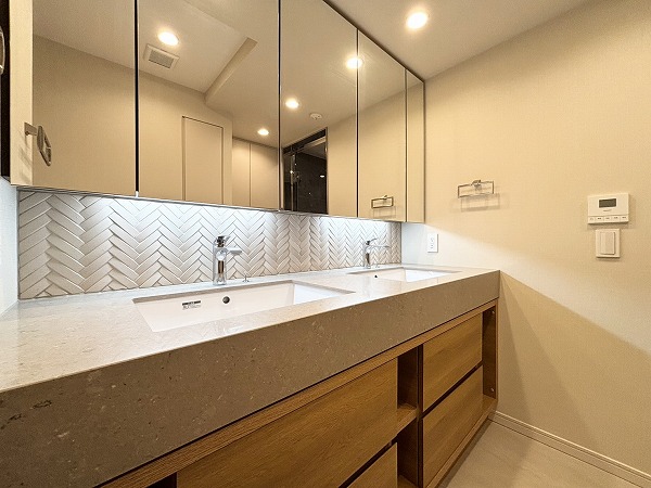 2ボウルタイプの洗面化粧台は、ファミリーの暮らしを想定した贅沢仕様。朝晩の混み合う時間帯でも余裕を持って利用できます。また、鏡裏収納や下部キャビネットも充実し、歯ブラシやドライヤー、石鹸類のストック品までたっぷり収納可能です。