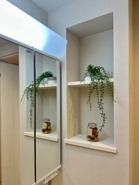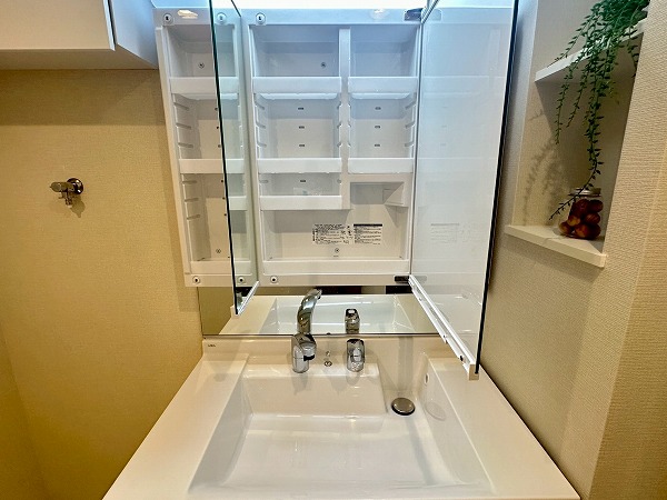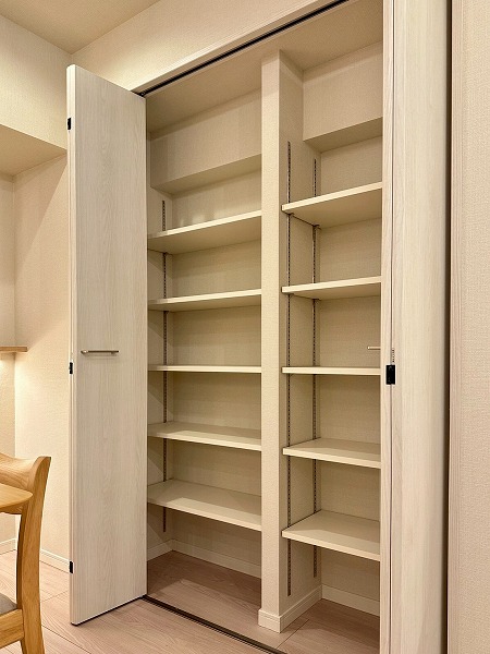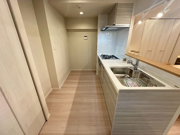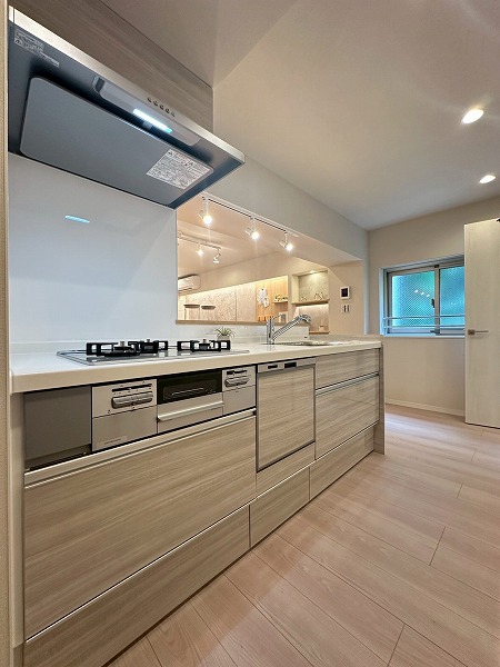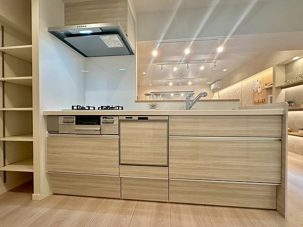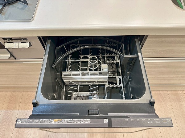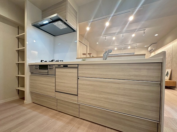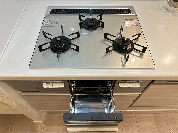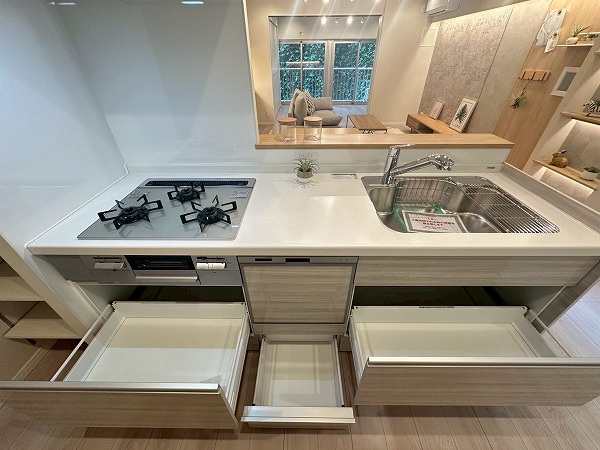 キッチンは使い勝手の良いカウンタータイプのシステムキッチンを採用。3口コンロと食洗機付きで、忙しい日々の家事をしっかりサポート!収納棚も充実しており、調理器具もスマートに片付きます。