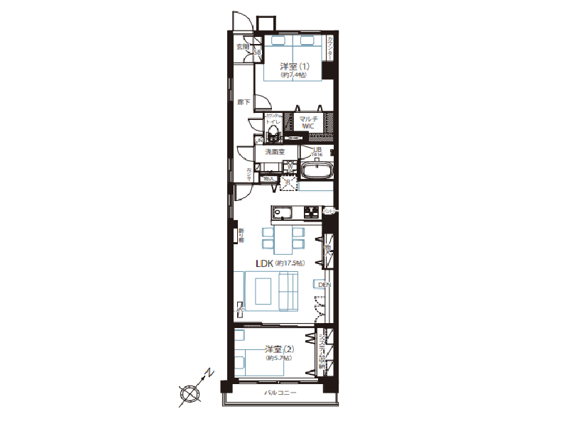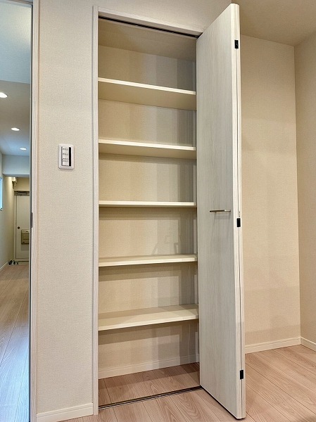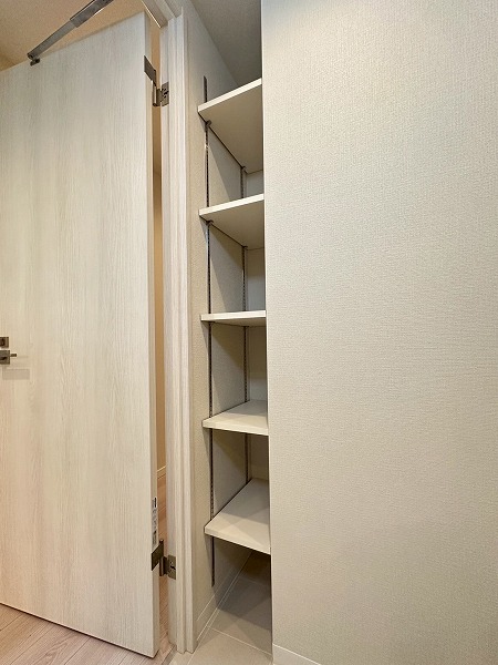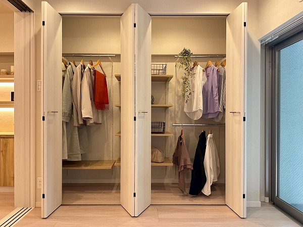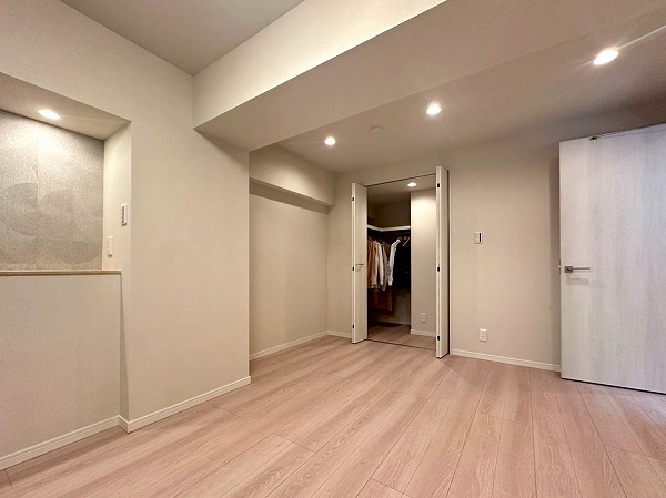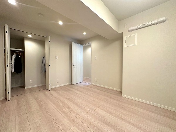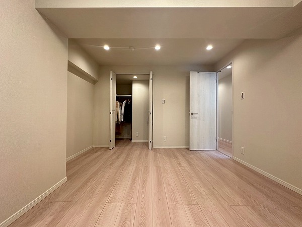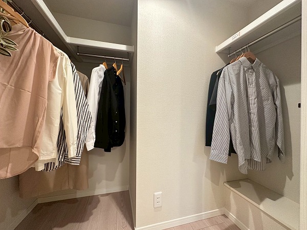 広さ約7.4帖の洋室は、収納力抜群のウォークインクローゼット付き。洋服はもちろん、バッグや小物まで整理整頓しやすい設計です。枕棚も備え付けられているため、季節ごとの衣替えもスムーズに行えますね◎